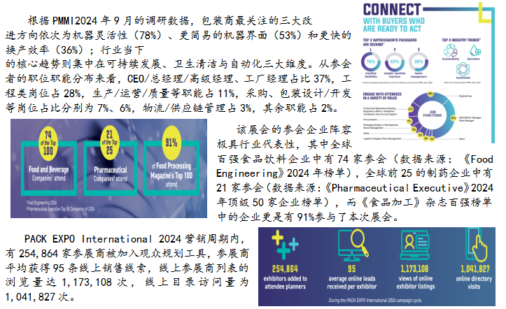 ★精准买家匹配:提前锁定高意向客户PMMI 为中国展商提供 “预登记买家匹配” 服务,根据展品类型,提前对接可口可乐、雀巢、强生等全球百强企业的采购团队;2024 年,中国展商通过该服务,平均提前获得 15-20 家意向买家的预约洽谈。
