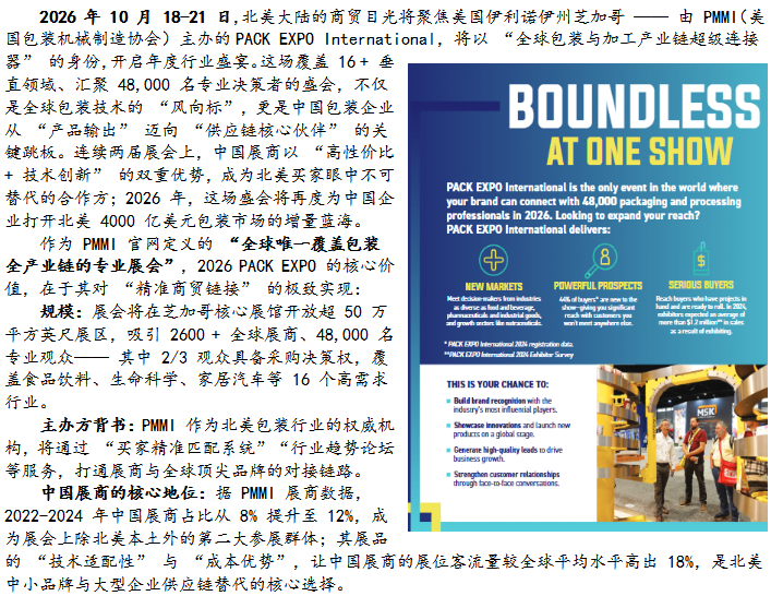 2026 年 10 月的芝加哥,将是中国包装企业向全球展示 “智造实力” 的舞台。从精准对接 48,000 名专业买家,到叩开北美 4000 亿市场的增量空间,PACK EXPO 不仅是一场展会,更是中国包装品牌 “出海进阶” 的黄金窗口。