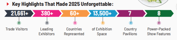 观众数据:双展累计吸引全球超 4.3 万名专业买家,其中 Anuga Select India 接待 21,661 + 名贸易观众,Anuga FoodTec India 迎来 21,875 名专业访客,覆盖 60 + 国家和地区,包括美国、德国、沙特阿拉伯、日本、韩国、新加坡等核心贸易伙伴;