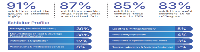 参展商高度认可:Anuga Select India 90% 参展商对展会效果满意,58% 已确认参加 2026 届;Anuga FoodTec India 91% 参展商高度评价观众质量,85% 锁定 2026 年展位,83% 将其列为 “行业必参展会”。
