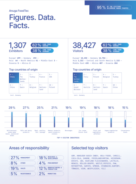 2024 年 Anuga FoodTec 以 “责任” 为核心主题,交出了一份亮眼的成绩单,为 2027 届展会奠定了坚实基础。展会的规模与国际覆盖面再创新高,充分印证了其在全球食品饮料技术领域的不可替代地位: