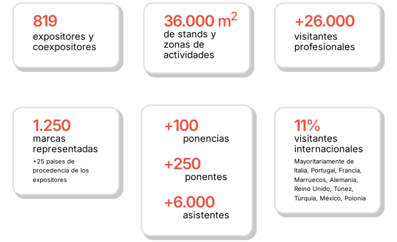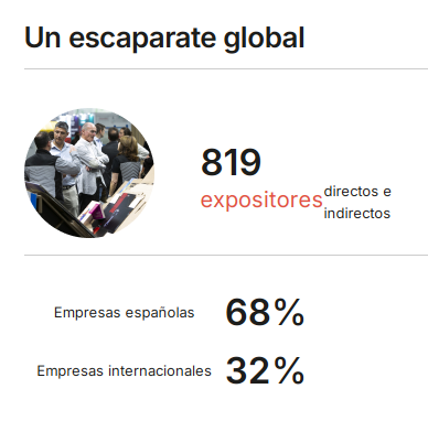 参展商核心数据与结构:展会共有819家直接与间接参展商参与,地域分布上68%为西班牙企业,32%为国际企业。从业务领域来看,43%的企业专注于材料、表面处理等包装容器相关元件领域,44%聚焦于包装设备与机械领域,13%则致力于自动化、机器人技术与物流领域;展会还展示了来自西班牙25个自治区的1250个品牌,展位及活动区域面积达36000平方米。